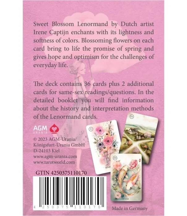 Met de lichtheid en zachtheid van de kleuren weet de Nederlandse kunstenaar Irene Captijn je te betoveren met deze Sweet Blossom Lenormand. De lente komt tot leven met de bloeiende bloemen op elke kaart. Zo geeft het deck hoop en optimisme voor de uitdagingen van het dagelijks leven.