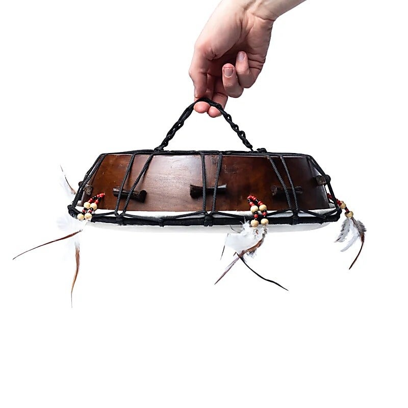 Handgemaakte trommel van geitenhuid, met decoratieve veren en kralen, met een prachtig frame dat traditioneel is vervaardigd van massief mahoniehout.