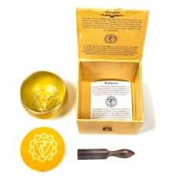 Chakra Klankschaal Solar Plexus Chakra (net boven de navel). Zijn functie is wilskracht. Zijn innerlijke staat is lachen vreugde woede. De kleur is geel en de planeten zijn Mars en de zon. De stenen zijn Amber Topaas Citrien. Het in evenwicht brengen van dit chakra wordt geassocieerd met het kalmeren van emoties en frustratie het verlichten van spanning en het helpen om intuïtie beter te benutten. Deze klankschaal is het perfecte geschenk voor een beetje extra innerlijke rust.
