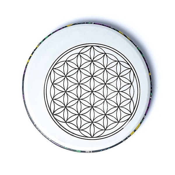 Duurzame handtrommel van synthetisch materiaal, met een Flower of Life-patroon.