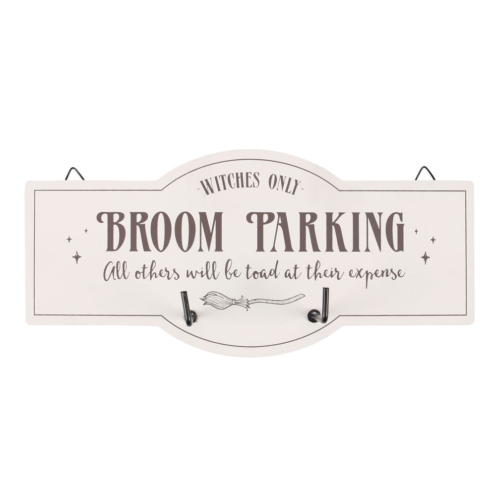 Parkeer je bezemsteel (of sleutels en paraplu) op deze speelse heksenwandhaak! Het bord toont een leuke illustratie van een bezem en de tekst: “Witches Only – Broom Parking – All others will be toad at their expense”. Voorzien van twee metalen haken, ideaal voor een magische touch in huis. Ontworpen door Something Different Wholesale en onderdeel van de Broomsticks-serie met heksencadeaus en woondecoratie.