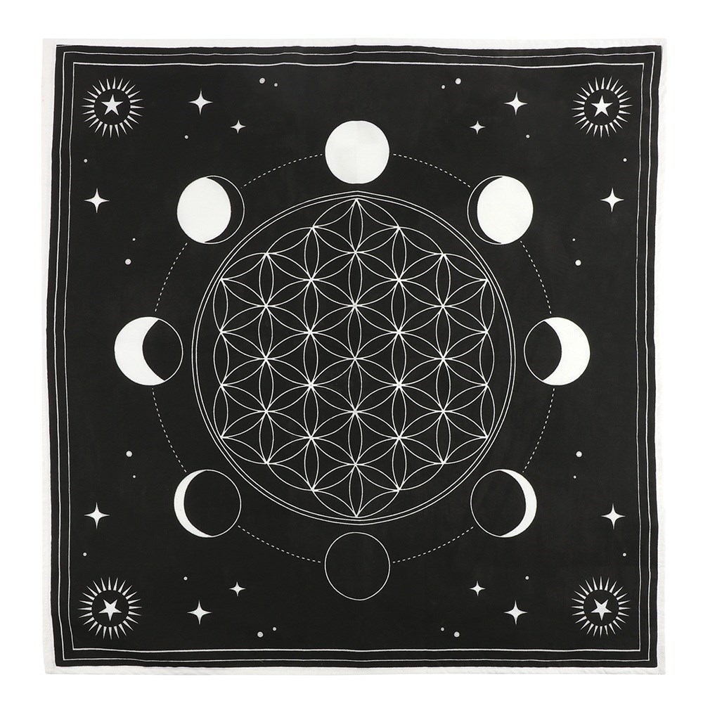 70x70cm Moon Phase Altar Cloth – Crystal Grid & Flower of Life Design