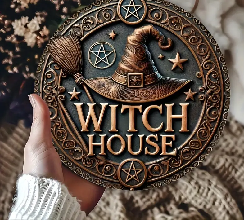 Breng een vleugje mystiek in je interieur of tuin met dit vintage "Witch house" muurbord.