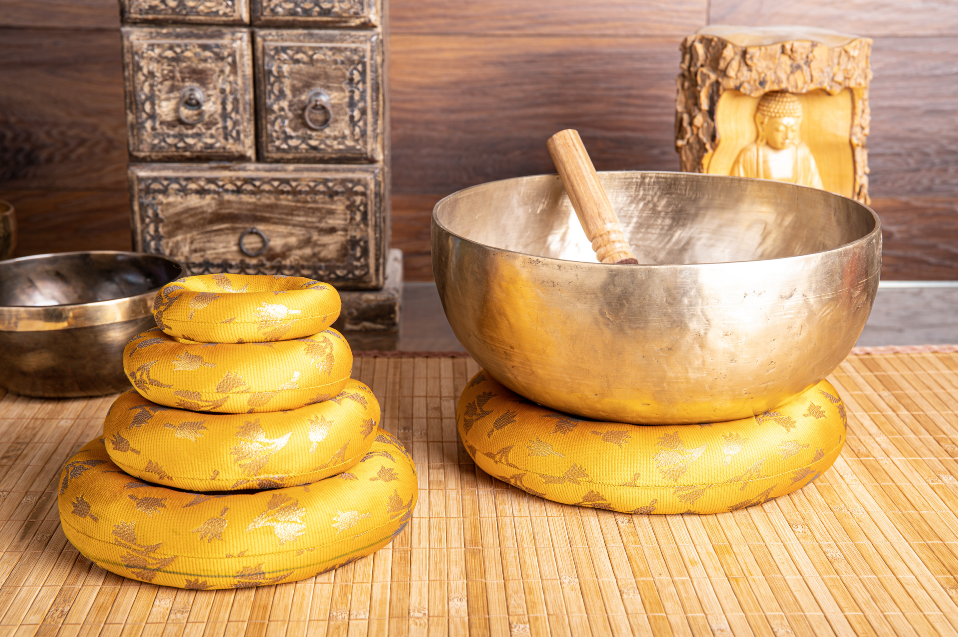 Klankschaal kussen Donut 16 cm – Geel, Traditioneel Nepalese Stijl