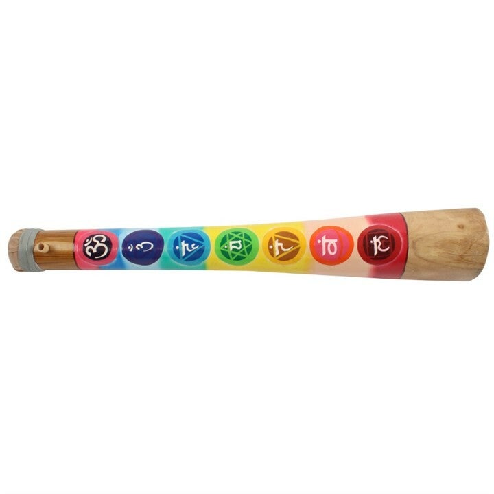 Felgekleurd muzikaal hoorninstrument met ingewikkeld ontwerp. Ethisch geproduceerd en handgemaakt op Bali. Elke hoorn heeft de zeven chakrasymbolen en bijbehorende regenboogkleuren.