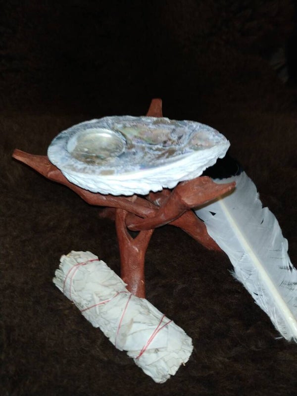 Abalone Schelp : de Abalone Schelp vertegenwoordigt het element water, een van de elementen die tijdens het smudgen aanwezig hoort te zijn. De schelp is het omhulsel van de Abalone zeeslak en is gevonden in Nieuw-Zeeland. Door de natuurlijke luchtgaten is deze sterke schelp zeer geschikt als schaaltje om mee te smudgen. Om oververhitting en verbranding van het parelmoer te voorkomen, plaats je een laagje zand in de schelp.