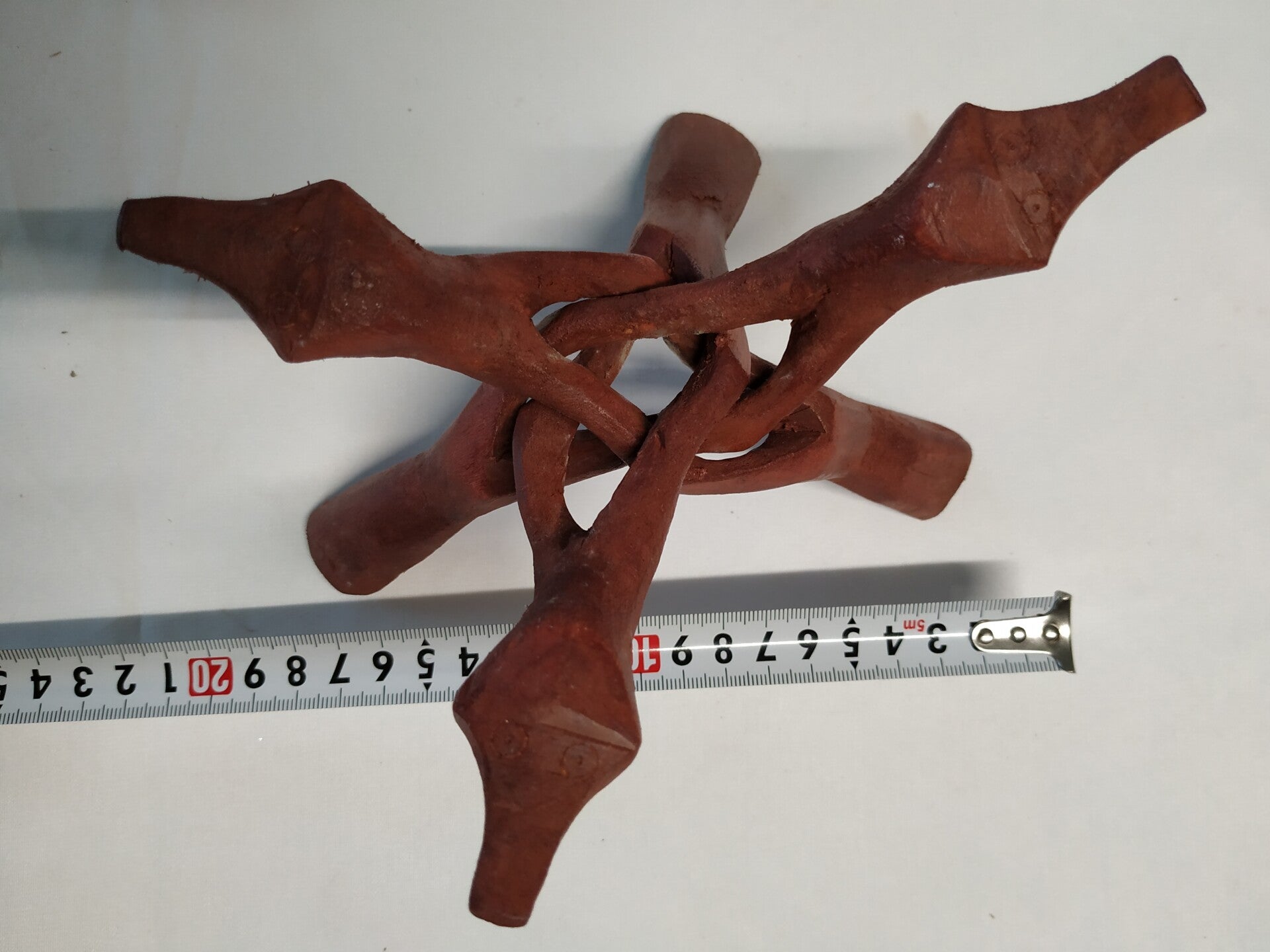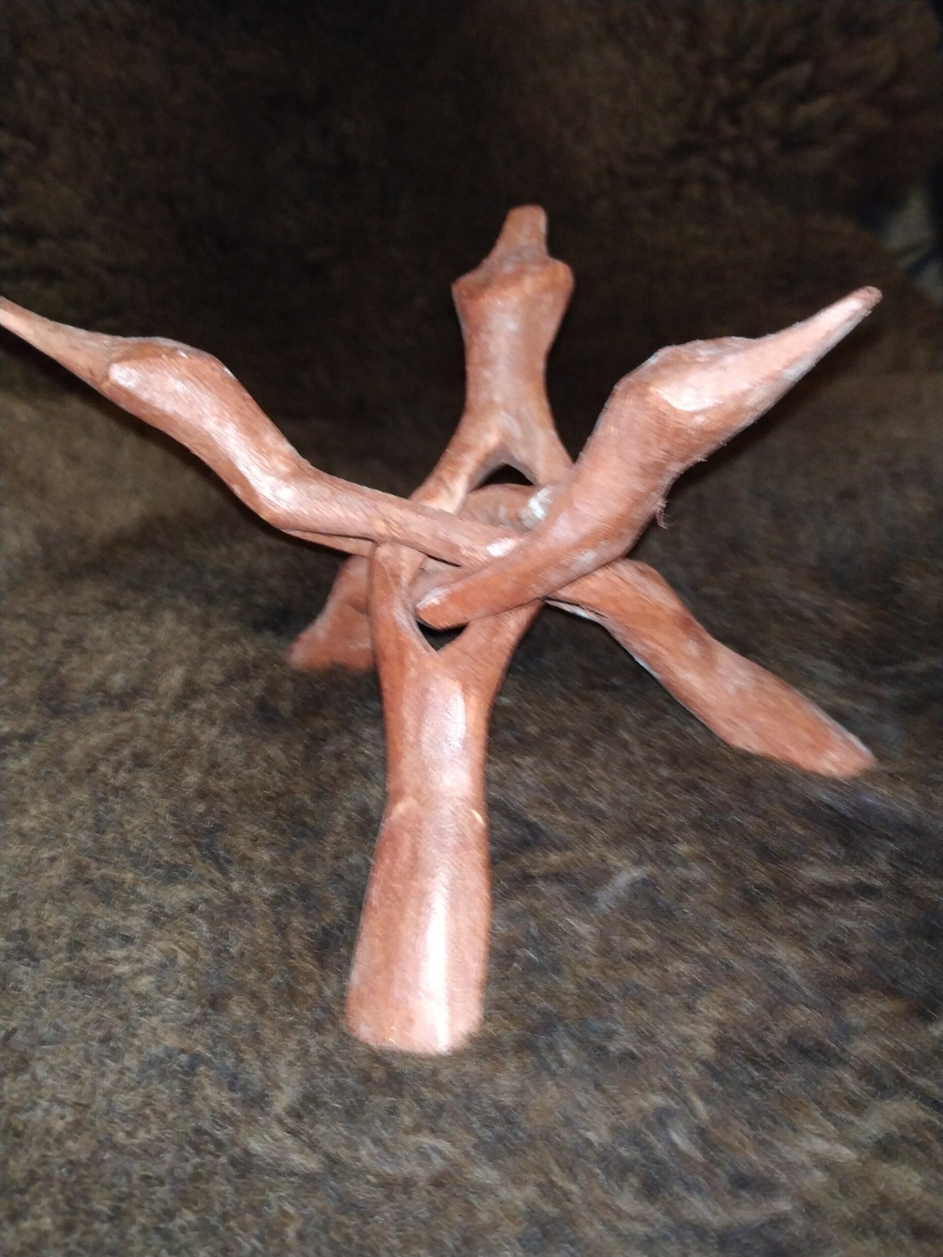 Een leuke in elkaar verweven houten driepoot met dierenkopjes. Te gebruiken voor bijvoorbeeld een glazen bol, een schaal, een mooie grote steen, een zee-egel, enz. van ongeveer 10-20 cm.