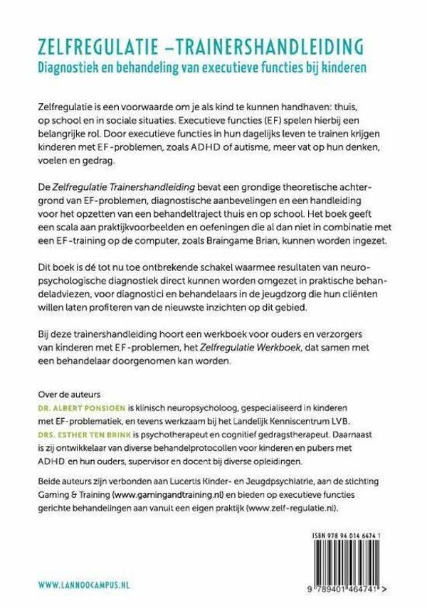 Zelfregulatie is een voorwaarde om je als kind te kunnen handhaven: thuis, op school en in sociale situaties. Executieve functies (EF) spelen hierbij een belangrijke rol. Door executieve functies in hun dagelijks leven te trainen krijgen kinderen met EF-problemen, zoals ADHD of autisme, meer vat op hun denken, voelen en gedrag. De Zelfregulatie Trainershandleiding bevat een grondige theoretische achtergrond van EF-problemen, diagnostische aanbevelingen en een handleiding voor het opzetten van een behandeltraject thuis en op school. Het boek geeft een scala aan praktijkvoorbeelden en oefeningen die al dan niet in combinatie met een EF-training op de computer, zoals Braingame Brian, kunnen worden ingezet. Dit boek is dé tot nu toe ontbrekende schakel waarmee resultaten van neuropsychologische diagnostiek direct kunnen worden omgezet in praktische behandeladviezen, voor diagnostici en behandelaars in de jeugdzorg die hun cliënten willen laten profiteren van de nieuwste inzichten op dit gebied. Bij deze trainershandleiding hoort een werkboek voor ouders en verzorgers van kinderen met EF-problemen, het Zelfregulatie Werkboek, dat samen met een behandelaar doorgenomen kan worden