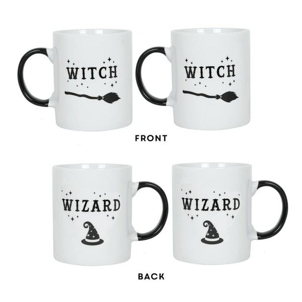 Deze set van twee mokken zijn beide bedrukt met het woord 'Witch' aan de ene kant en 'Wizard' aan de andere kant