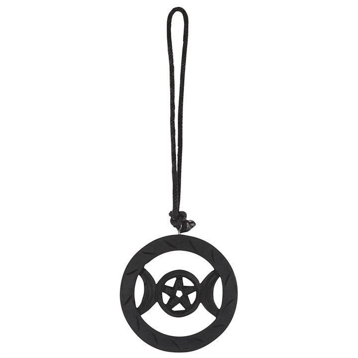 Gemaakt van hout, deze zwarte hangende zwarte Triple Moon is prachtig gemaakt en kan in huis, op kantoor of zelfs in de auto worden opgehangen.