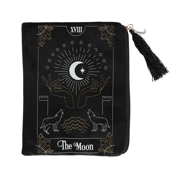 Dit fluwelen zakje met rits is de perfecte plek om tarotkaarten, kristallen, schoonheidsproducten en andere schatten te bewaren. Voorzien van een prachtige witte en gouden maan-tarotkaartillustratie op de voorkant en een bijpassende kwast en maansikkel op de rits.